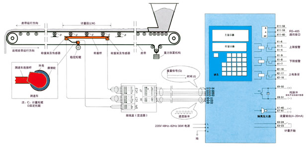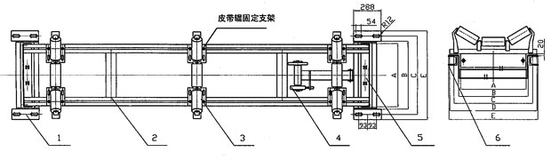 1:承重架 2:稱重橋 3:托輥架及托輥 4:測速機構及測速傳感器 5:荷重傳感器 6:皮帶輸送機并配有JL500B稱重控制儀表